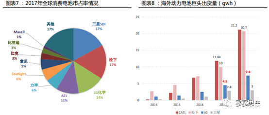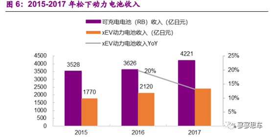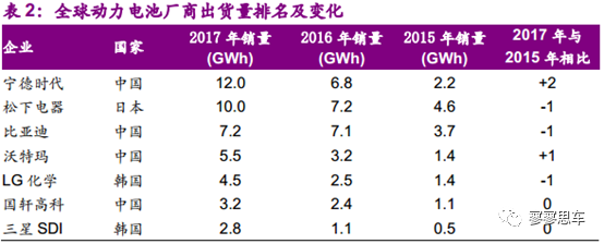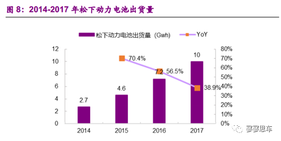根据GGII的数据,2015/2016/2017年,松下动力电池出货量分别为4.6/7.2/10Gwh,分别同比增长70.4%/56.5%/38.9%。从全球出货量排名来看,2015年、2016年均为全球第一,但2017年被宁德时代超越。