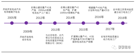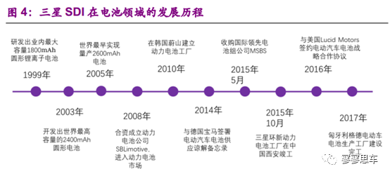 三星SDI创立于1970年,于1999年成功研发出行业内最大容量的1800mAh圆形锂离子电池,自此开始进入锂电池领域。2008年,三星SDI和博世合资成立了动力电池公司SBLimotive,进入汽车动力电池领域;2015年,三星SDI全资收购国际领先的电池公司MSBS,并先后在韩中美欧等地建立了汽车动力电池工厂。
