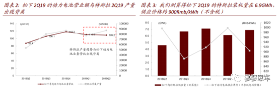 特斯拉2Q放量并未带动松下动力电池业务增长,我们测算松下供应单价有所下降。特斯拉2Q19共生产8.7万辆电动车,同比增长12.9%,其中Model S/X 1.45万辆,Model37.25万辆。我们测算得松下对特斯拉2Q19对应供应量可达6.9GWh,环比增长12.3%,但对应营收环比则下降。从趋势上,2Q19特斯拉产量与松下动力电池销量额的趋势也出现较为明显的背离。假设特斯拉电池占松下动力电池销售额90%,我们测算得,松下2Q19的电芯供应价格约为904元/kWh,低于1Q19的998元/kWh与FY2019平均的939元/kWh(不含税)。