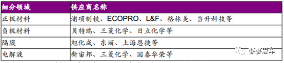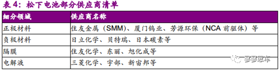 松下的供应商大多为中日韩龙头企业。其中:(1)正极材料供应商包括住友金属等;(2)负极材料供应商包括日立化学等;(3)隔膜供应商包括住友、东丽等;(4)电解液供应商包括三菱化学、宇部等。