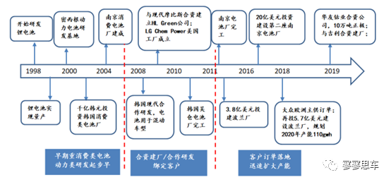 锂电领域传统强企,精准把握电动化浪潮迅速扩产:LG化学1998年正式开始研发锂离子电池,1999年实现小电池量产,发展时间略晚于日本厂商。动力电池研发始于2000年密西根研发基地,2011年开始公司在各地规划建设生产基地,不韩国车企合作研发幵配套使用,2015年开始在中国、欧洲各地迅速扩大产能,2017年开始上量,18年规模突破7gwh。