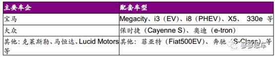 自三星SDI进入动力电池领域以来,欧洲、美国和亚洲的主要汽车制造商开始与其开展合作项目,迄今为止已被选为30多种电动汽车的核心电池供应商。三星SDI是BMW的官方战略合作伙伴,其他核心客户包括大众、克莱斯勒、马恒达、LucidMotors等。主要配套车型有宝马的Megacity、i3(EV)、i8(PHEV)以及X5、330e等,还有菲亚特(Fiat500EV)、保时捷(CayenneS)、奥迪(e-tron)、奔驰(S-Class)等重要车型。