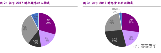 松下的业务板块包括Appliances(AP)、Eco Solutions(ES)、Connected Solutions(CNS)和Automotive & Industrial Systems(AIS)等。2017年(2017年4月1日-2018年3月31日,下同),松下销售收入为79,822亿日元,同比增长9%,营业利润为3805亿日元,同比增长37%。