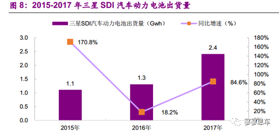 根据SNE的数据,2015/2016/2017年,三星SDI汽车动力电池出货量分别为1.1/1.3/2.4Gwh,同比增速分别为170.8%/18.2%/84.6%,在全球出货量排名中分别排第10/9/5名。