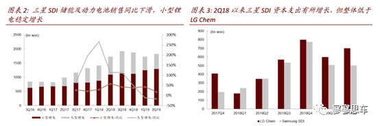 三星SDI2Q19营收2.4万亿韩元,同增7%,其中电池业务同增5.4%。三星SDI近期公布2Q19业绩,总营收2.4万亿韩元,同增7%,营业利润1573亿韩元,同增2.9%。其中锂电池营收1.8万亿韩元,同增5.4%。锂电池细分里小型锂电营收约1.29万亿韩元,同比增长18.3%,大型锂电(储能及动力电池)营收约5314亿韩元,同比下降16.6%。
