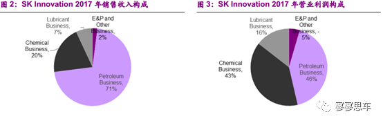 SK Innovation是韩国首家大型能源、化工企业,其业务范围包括石油开发及其他业务、石油业务、化学业务和润滑油业务。2017年,SKI的销售收入为462,609亿韩元,同比增长17.06%,营业利润为32,344亿韩元,同比增长0.19%;其中,勘探与开发及其他业务(E&PandOther Business)/石油业务(PetroleumBusiness)/化学业务(ChemicalBusiness)/润滑油业务(LubricantBusiness)的销售收入占比分别为2%/71%/20%/7%,营业利润占比分别为-5%/46%/43%/16%。动力电池业务归属于勘探与开发及其他业务板块。