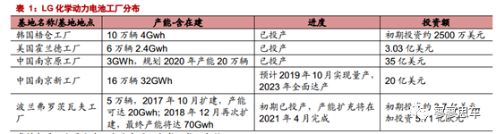 目前LG动力电池生产基地主要有韩国吴仓、美国密西根、中国南京、波兰。韩国吴仓工厂5gwh产能主要针对现代以及机动调配;中国南京工厂(2个)规划35gwh左右主要针对中国市场;波兰工厂追加投资,规划产能提升至70gwh,主要针对欧洲市场,锁定大众、宝马等;美国工厂2gwh针对通用、福特等美系车。公司计划2020年四大基地合计产能扩大到110gwh。