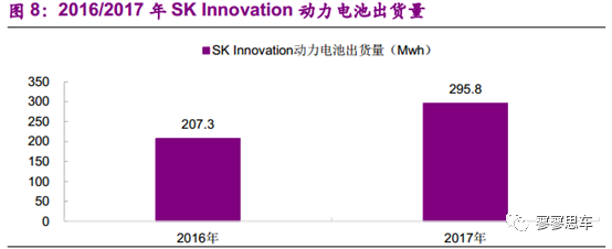 根据SNE的数据,SKI动力电池的出货量在2016年为207.3Mwh,在2017年为295.8Mwh,2017年增速达到42.7%。
