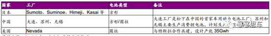 日本:生产动力电池的工厂包括Sumoto、Suminoe、Himeji、Kasai等,以方形电池为主。