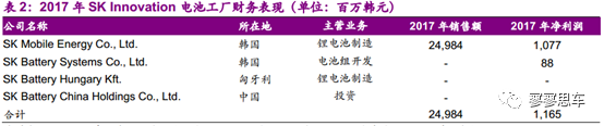 SKI已在韩国、匈牙利、中国设立4家动力电池工厂,目前只有韩国工厂量产动力电池,匈牙利和中国工厂正在建设中。根据SKI的公告,2017年位于韩国的电池制造工厂销售额为250亿韩元(折合人民币约为1.53亿元)。
