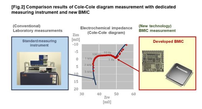 除了传统功能,新开发的BMIC测试芯片还内置电化学阻抗测量功能,利用交流电励磁法进行测量。电化学阻抗测量是通过15个完全并联模拟/数字转换器、0.1 Hz到5khz的脉冲调制交流电励磁电路,以及内置在BMIC中的复数电压/复数电流转换电路来实现的。因此,BMIC芯片可以测量电池运行时的电化学阻抗,而不需要对目前电池中的BMS配置进行重大调整。