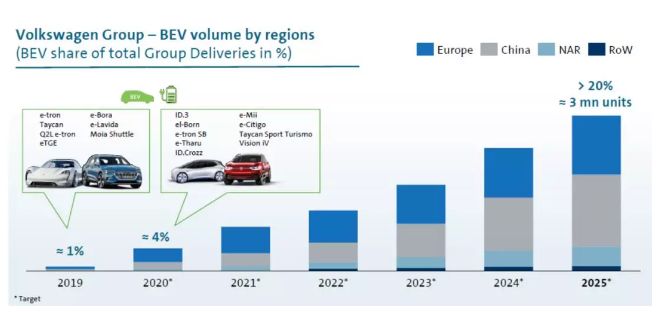 从海外来看,大众、宝马均已在新能源汽车领域大步前进。其中大众目标到2025年新能源汽车销量占比将从2019年的1%左右上升到超过20%,发展相当迅速;同时宝马也与宁德时代、三星SDI签订了2021-2031年合计103亿欧元的电池供货合同。