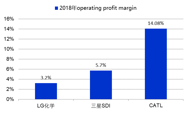 国内情况来看,比亚迪由于垂直整合的因素难以分拆动力电池的盈利情况,而宁德时代2018年营业利润率为14.08%,远高于三星SDI和LG化学。
