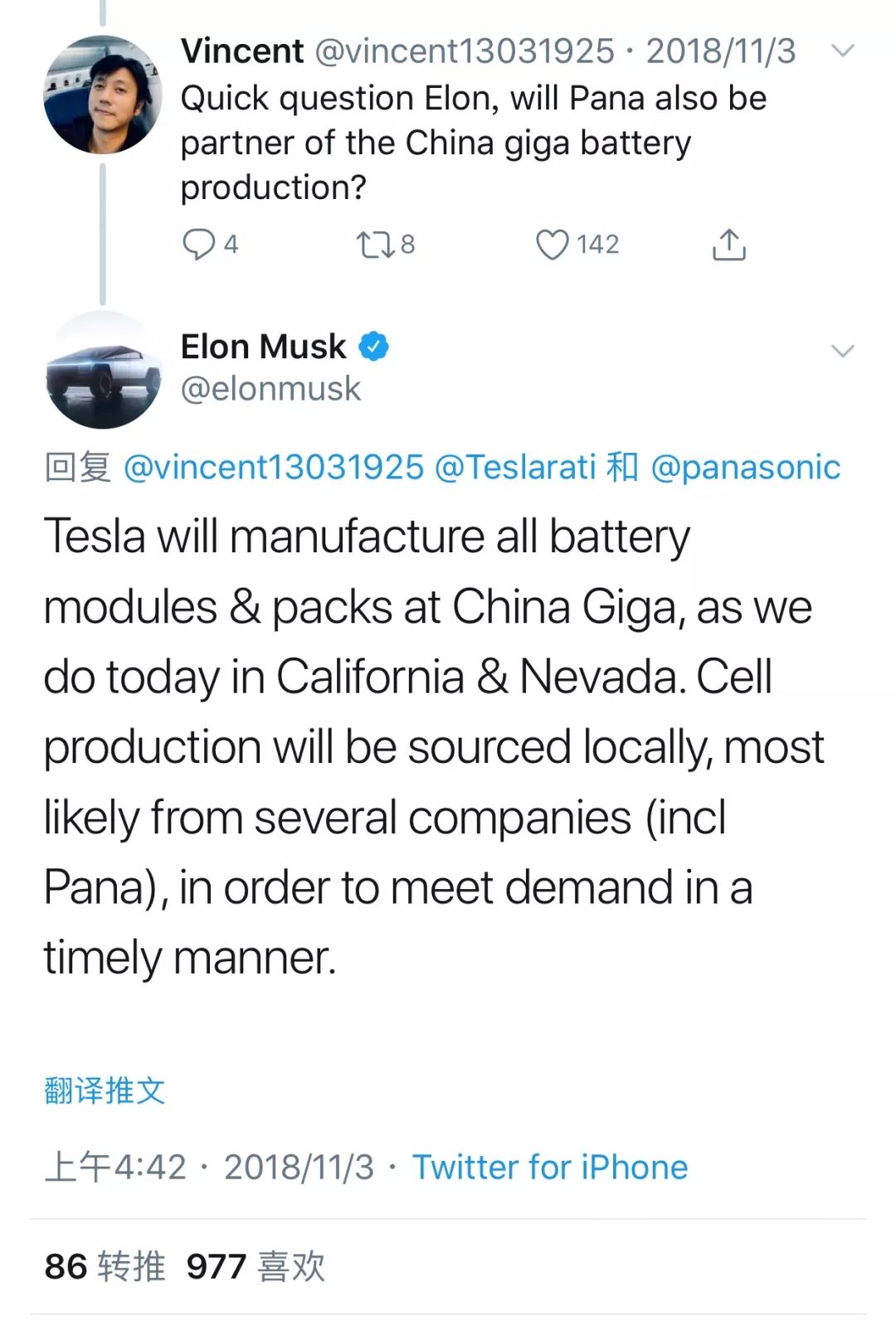 一片祥和中,没有人站出来质疑马斯克的计划,毕竟他吹过的牛都实现了。但是随后的产能地狱让马斯克认识到事情并不像他想象的那么简单,直到2018年年中,Model 3的产能终于达到5000辆/周,年产50万辆的目标算是实现了一半。从后续的媒体报道来看,双方虽然在磨合中有一些冲突,但是并没有摆在台面上的针锋相对,在外界看起来双方仍然是亲密无间的。松下执行副总裁山田佳彦曾经在形容与特斯拉关系时表示,“我想特别说明一下松下和特斯拉的关系,在五六年前我们是供应商和客户的关系,这是传统的业务关系。但当我们投资Giga 1 后,我们的关系是密切而独特的。今天的电池产能是以前的三倍,为什么?这是特斯拉和松下员工一起工作的结果。我们不是简单的买方和供应商关系,这种关系在商业上是很新的。”2018年5月,关于特斯拉在中国建立工厂的计划,津贺一宏在接受媒体采访时表示,“如果有要求,我们愿意与他们合作。”2018年11月,在确定了中国工厂已经实质性落地上海临港之后,马斯克通过twitter表示,中国工厂的电芯将由包括松下(pana)在内的几家公司本土化供应,为的是尽快实现投产。为了防止被外界误会和松下的关系,马斯克还进一步澄清,特斯拉的长期目标是本地生产、本地销售,这对于降低价格是非常重要的。