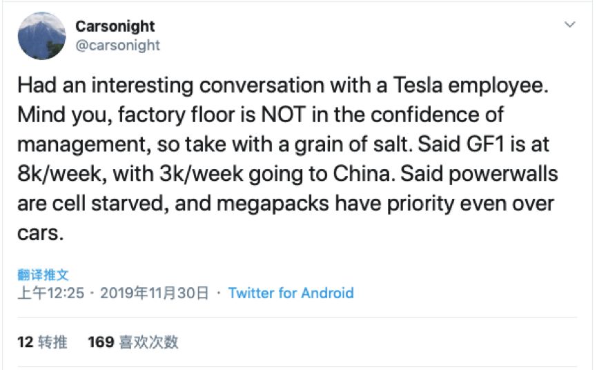 推特上有个自称有朋友在Giga1工作的“舅舅党”表示,特斯拉每周往上海工厂运送大概3000个电池包。