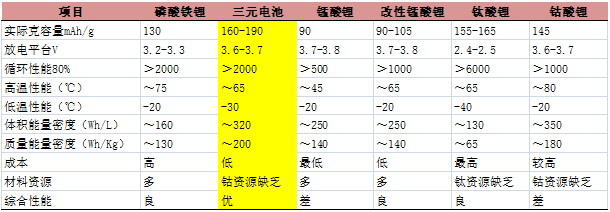 实际上为什么三元电池是主流路线,还需要用数字来说明。首先,我们将三元电池与动力电池其它技术路线进行对比,包含现在常用的磷酸铁锂、锰酸锂、钛酸锂等,可以看到三元电池的优点有: