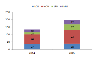 正极材料是三元电池区别于其它动力电池的最核心部分,因此有必要对其进行单独分析。2015年,中国厂商三元正极材料出货量3.7万吨。虽然没有动力三元正极材料的统计,但根据三元动力电池出货量4.26GWh测算,对正极材料的需求为9400吨,需求占比接近25%。