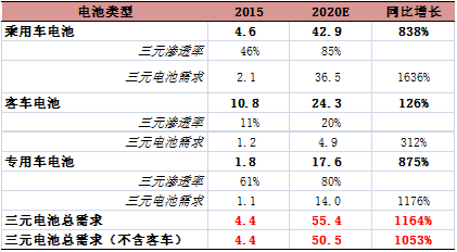 再将电池需求按照车型进行拆分,并结合我们对三元电池渗透率的测算,测算出2020年三元电池需求量可达55.4GWh,对比2015年增长11.6倍。即使假设政府对于三元电池在客车上使用不解禁(可能性很小),2020年三元电池需求也将达到50.5GWh,增长10.5倍。
