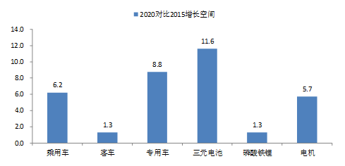 再进一步的,我们将新能源汽车各个部件进行拆分,继续以物理量为单位进行测算,得出各部分在2020年的市场规模对比2015年的增长空间。可以看到,三元电池在整个产业链中也是最值得投资的部分。
