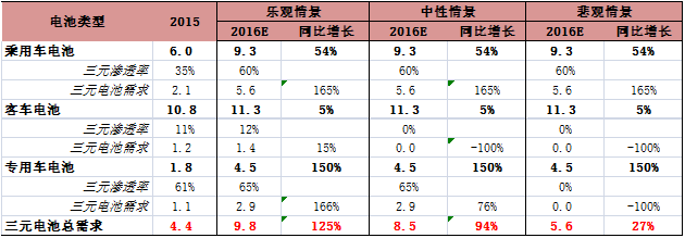 政策面:打击骗补、补贴调整和物流车进补贴目录,均在客观上起到了对高能量密度优势的三元电池需求,行业后续政策催化剂此起彼伏;需求端:加总乘用车和物流车的需求,2016年三元电池的需求量将达到8.5GWh,同比增长94%,行业的翻番增长是大概率事件。