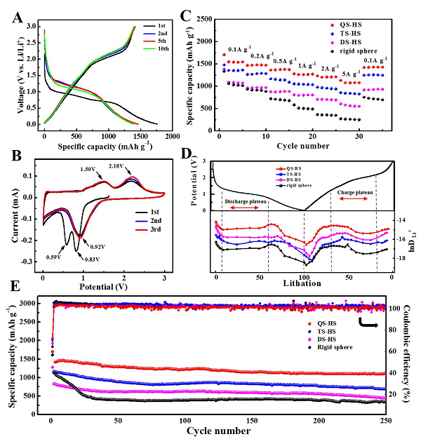 该工作的创新之处在于首次报道了一种简便且通用的方法来合成过渡金属氧化物并且设计组分可调,层数可控的空心微球。其中四层空心微球提高了材料的结构稳定性,缩短了离子扩散路径,从而显著提升了锂离子电池电极材料的循环性能与倍率性能。这项工作拓宽了设计过渡金属氧化物等材料的研究思路并可通过定向合成特定层数的中空多层材料以实现与优化材料所需的性能。