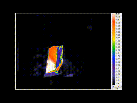 实验中采用的锂离子电池为Turnigy nanotech的160mAh软包锂离子电池,其正极材料LCO材料,负极采用石墨材料,实验过充中采用3A的电流对电池进行持续的过充,一直到电池发生热失控。下图b为该电池在持续过充过程中电池表面温度和电压变化的曲线,从图中能够看到在前110s过程中电池温度缓慢的从20℃升高到40℃,随后电池的电压曲线出现了一个平台,在120s后,电池的电压开始再次快速上升,同时伴随着电池的温度的快速上升。在180s后电池的电压也是出现了一个阶跃,直接升高到设备的最高电压,在这一过程中电池的温度也短时间内大幅升高,达到热成像相机的最高温度以上,电池发生热失控。