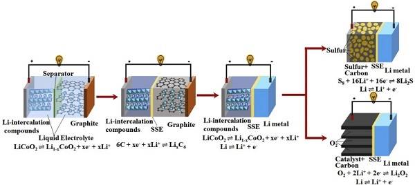 图二、使用固体电解质到基于锂金属负极的ASSLMBs、ASSLSBs和ASSLABs等先进电池的锂电池从常规LIBs到ASSLIBs的发展趋势示意图