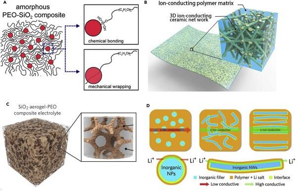 目前已广泛的研究了纳米粒子填充的CPEs。与具有粒子—粒子结的纳米粒子不同,由于纳米线表面上的连续和扩展的跳跃路径,纳米线可以构建用于快速锂离子传输的3D网络。同时,二维(2D)中孔纳米片如蒙脱石、粘土和云母也是高性能CPEs的填料。