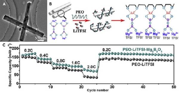 (B)具有Mg2B2O5 NWs的CPEs中的锂离子传导的示意图;