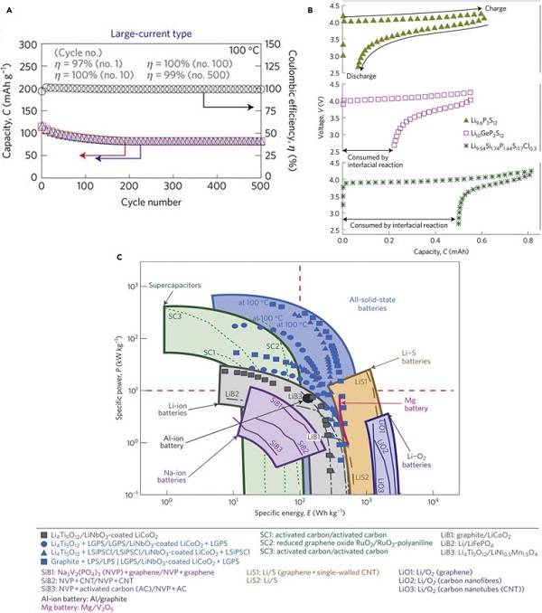 (A)在18 C和100℃下,LTO/Li9.54Si1.74P1.44S11.7Cl0.3/LCO ASSLBs的循环性能;
