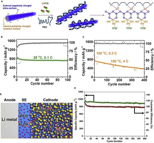 (A-C)示意图显示了HNT改性的柔性PEO CPEs的制备方法和HNT添加机理,用于在25 ℃(B)和100 ℃(C)下提高电池的离子电导率(A)和循环性能;