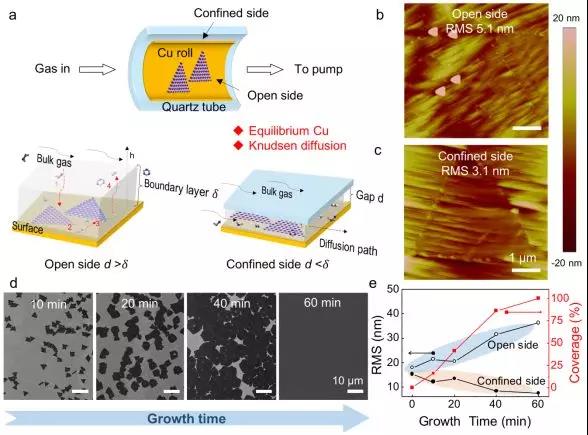 为解决上述难题,本文发展了一种化学气相沉积限制空间方法以实现大面积单层h-BN薄膜的制备。该方法以氨硼烷为前驱体,置于气流上游,并将生长衬底-多晶铜箔卷曲于石英管内侧置于反应炉高温区,进而在靠近石英管内壁的铜箔表面制备出接近完全单层的h-BN薄膜。