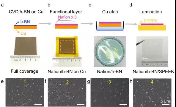该研究以“Sandwiching h-BN Monolayer Films Between Sulfonated Poly(Ether Ether Ketone) and Nafion for Proton Exchange Membranes with Improved Ion Selectivity”为题,发表于ACS Nano上(DOI: 10.1021/acsnano.8b08680)。