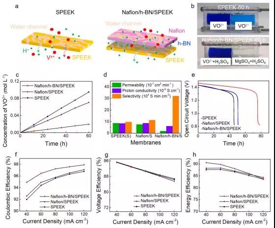 表征结果显示二维h-BN具有很高的晶体质量以及均一性。研究者还发展了一种功能层辅助转移方法,可实现厘米级二维薄膜的无损转移,并在此基础上制备出了Nafion/h-BN/SPEEK三明治薄膜,首次在全钒液流电池中得以应用。该三明治薄膜由于h-BN的加入,在钒离子渗透率显著降低的同时质子电导率几乎不变,因而较之纯SPEEK膜,离子选择性提高了三倍。