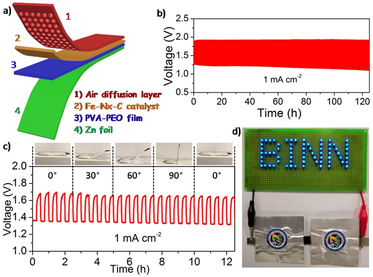 图2. a) 柔性可折叠锌-空气电池示意图; b) 在1 mA cm-2的电流密度下电池充放电曲线; c) 柔性锌-空气电池的折叠性能测试;d) 串联的两组柔性锌-空气电池为发光二极管阵列供电。
