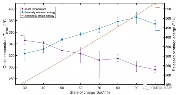 图1. 电池不同SOC下加热触发热失控温度及能量释放。