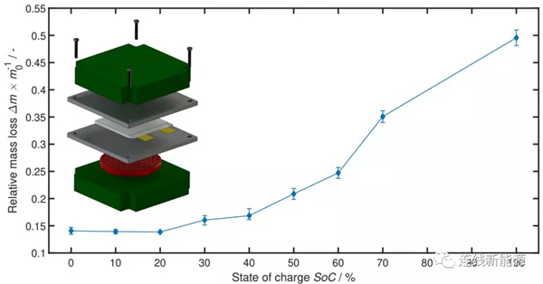 实验使用的电池为NMC体系、容量40 Ah的软包电池。在多并电池热失控实验之前,作者先考察了电池在不同SOC下加热的热失控行为,实验示意图如图2所示。软包电池被夹具固定,通过加热板加热触发热失控。如图1和图2所示,随着电池SOC从30%增加到100%,加热触发热失控的起始温度不断降低,同时电池热失控释放的能量和失重量不断增加。值得注意的是图1中100%SOC电池热失控释放的能量反而较90%SOC有所降低,而失重却显著增大,作者判断这是由于100%SOC下电池热失控极为猛烈导致很多未来得及反应的内容物喷出所致(注:这一现象很关键,在企业中测试也能观察到类似现象)。此外,图1中未给出0%-20%SOC下电池的热失控触发温度和能量释放,这主要是此SOC范围电池热失控温度不好判断所致。从以上结果不难看出,SOC状态越低电池相对更为安全。