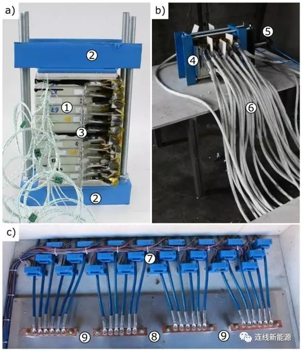 图3. 针刺触发多并电池热扩散实验装置图。图中1为模组中的电芯,2为夹具,3为busbar,4为完整模组,5为针刺触发器,6-9为连接线。