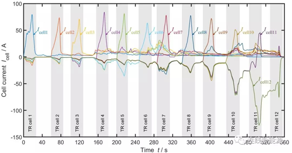 图4.针刺触发12P2S模组热扩散过程电流值变化。其中电流为正值表示该电池在充电,负值表示该电池在放电。图中的灰色区域表示单个电池的可见热失控过程。