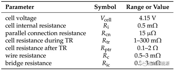 为了更好的模拟分析模组热扩散过程,作者刨除了测量设备的影响,并重新设计了等效电路模型。新的等效电路模型共包含三部分,具体如图3所示。模型中所用的参数同表1中的参数一致。