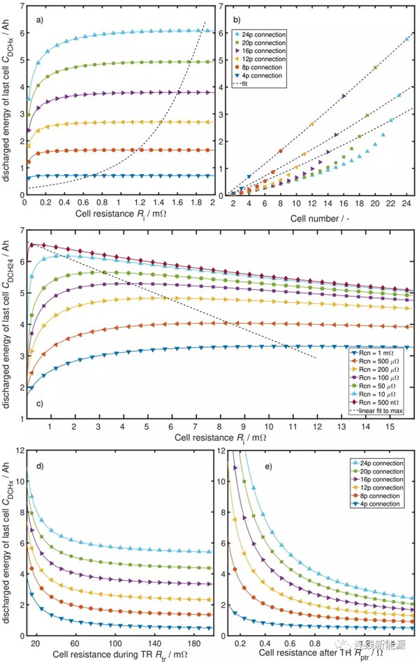 以多并电池模组中最后一个电池放电容量为考察点,图9系统总结了新等效电路模型得到的各因素对模组热扩散过程的影响结果。对比各因素的影响不难看出,Rptr值对电池放电容量的影响最大(图9e),尤其是并联电池数量增加、Rptr值减小的情形下。如上所述,Rptr值会受模组约束状态的影响,因此控制模组的约束状态对热扩散结果有显著影响。此外,从结果看共24个电池的多并模组热扩散过程最后一个电池的放电量CDCH≈6-10 Ah。结合图1和图2结果显示30%SOC以下电池更为安全,不难想到如果多并模组中电池单体总容量Ccell ≈10–15 Ah,就可以确保放电后电池SOC低于30%,从而降低电池热失控猛烈程度甚至阻止热扩散的发生。因此,在这个意义上讲,小容量电池多并较大容量电池少并更为安全。