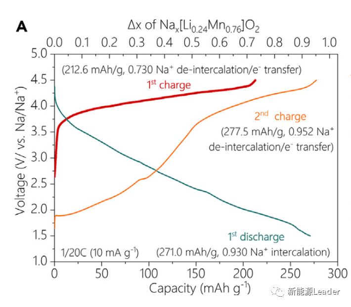 Xiaohui Rong等人开发的Na0.72[Li0.24Mn0.76]O2材料通过O元素的可逆氧化还原反应实现了270mAh/g的可逆容量,是目前可逆容量最高的Na离子电池正极材料,虽然材料的循环性能还有待提高,但是为我们开发下一代高容量正极材料提供了新的思路。