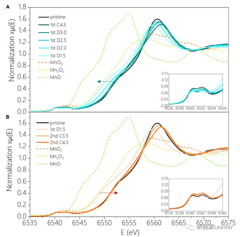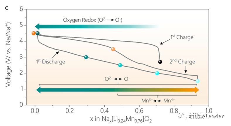 270mAh/g的高容量已经远远超出了Mn3+/Mn4+氧化还原对所能提供的容量,那么额外的容量所需要的电子来自哪里呢?为了解答这一问题,Xiaohui Rong对Mn元素在不同的充电截止电压的条件下Mn元素的K边X射线吸收图谱进行了分析(如下图所示),从下图我们能够看到在首次充电的过程中,我们看到Mn元素的K边吸收结构没有发生显著的改变,只是发生了轻微的偏移,这也表明在首次充电的过程中Mn元素的价态基本没有发生改变,因此首次充电的容量主要来自于O元素的氧化反应。在放电的过程中,在4.5-2.5V的范围内Mn元素的K边吸收结构也没有显著的改变,这表明在这一电压范围内提供的容量的主要是O元素的还原反应,如果继续放电到1.5V能够观察到Mn元素的K边吸收结构会向着低能量区域偏移,这表明Mn元素的价态出现了降低,这表明在较低的电压范围内的容量主要来自于Mn3+/Mn4+氧化还原对的反应,而在较高的电压范围内的容量则主要来自于O元素的氧化还原反应。
