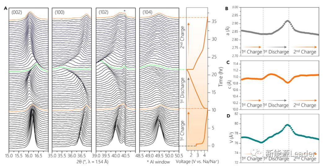 Mn基钠离子电池正极材料在Na+脱出和嵌入的过程中常常伴随着材料本身的相变(例如从P2相转变为O2相等),造成严重的体积变化等一系列问题,从而严重影响钠离子电池正极材料的循环稳定性。因此Xiaohui Rong也采用原位的XRD方法对Na0.72[Li0.24Mn0.76]O2材料嵌入和脱出Na+的过程中的结构变化进行了分析(结果如下图所示),从下图a中我们能够看到在整个充放电的过程中仅仅发生了特征峰的偏移,例如(100)、(102)和(104)几个特征峰在充电的过程中都向更高的角度发生了偏移,但是并没有形成新的特征峰,这也表明在充放电过程中Na0.72[Li0.24Mn0.76]O2材料中并没有形成新的O2或者OP4相,表明Na0.72[Li0.24Mn0.76]O2材料具有良好的结构稳定性,这也是良好循环性能的前提条件。