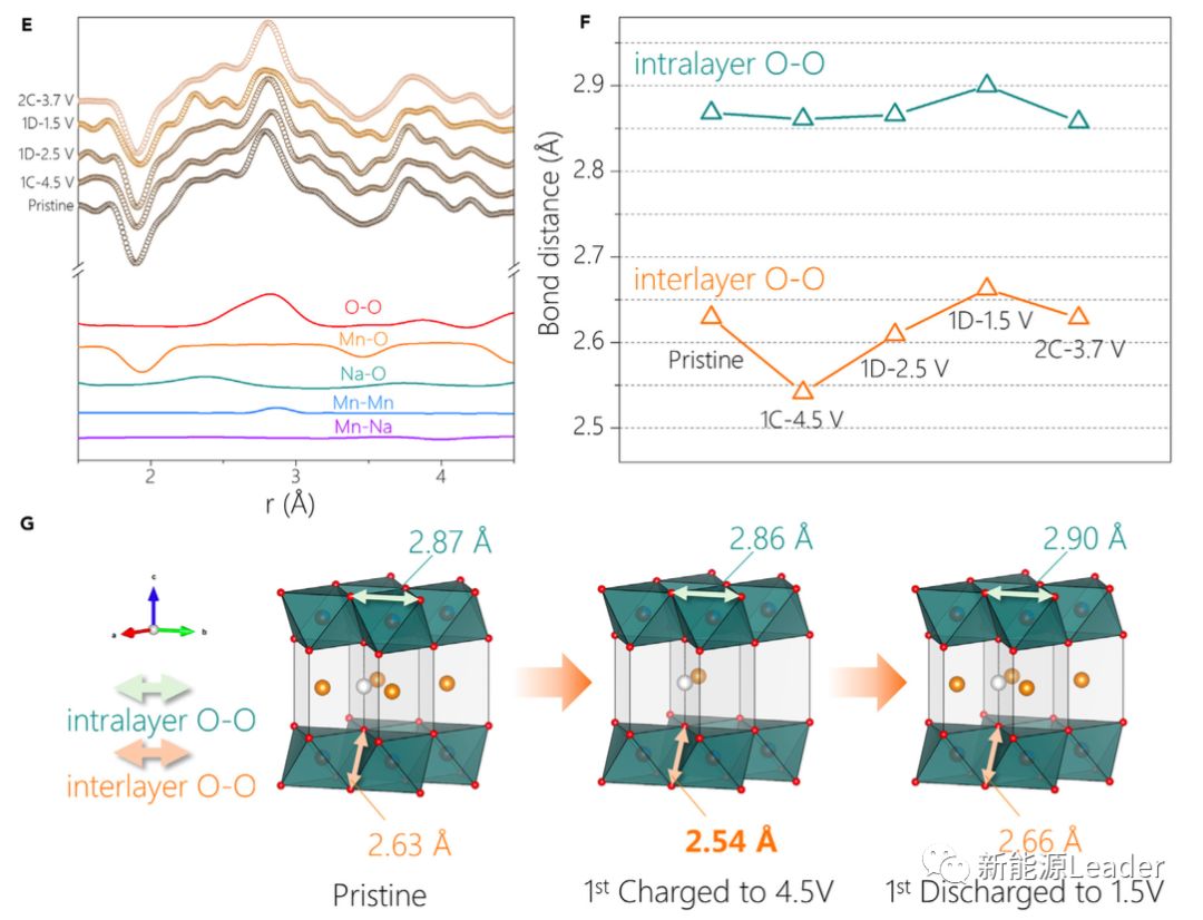 通过对nPDF进行拟合,我们还可以得到层内和层间O-O距离(结果如下图所示),从图中我们能够看到Na0.72[Li0.24Mn0.76]O2材料在充电后层间O-O距离出现了明显的缩短,这也表明在充电的过程中O元素被氧化,这也是O元素参与Na0.72[Li0.24Mn0.76]O2材料充放电反应的有力证据。