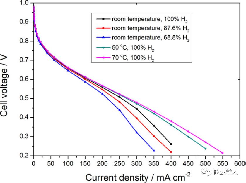 图1显示了在140℃的工作温度下,燃料电池在不同阳极露点温度下的极化曲线。从该图中我们可以看出,50℃阳极露点温度下的电池性能略低于室温阳极露点温度下的电池性能。高阳极露点温度( 70℃)下的电池性能严重下降,这表明在140℃的工作温度下阳极增湿对电池性能不利。