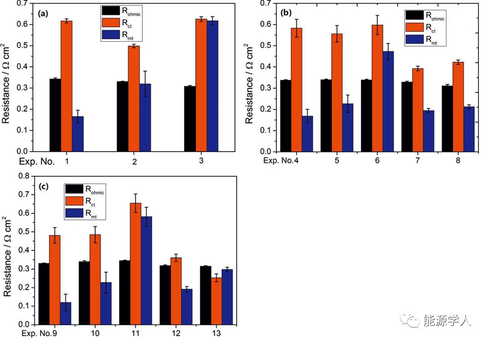 极化电阻由电荷转移电阻和质量转移电阻组成。为了区分电荷转移电阻和质量转移电阻的分布,图5是HT-PEM燃料电池测量阻抗谱中的拟合内阻: ( a ) 140℃,( b ) 160℃,( c ) 180℃。 (a)可以看出,在较低的操作温度( 140℃)下,传质阻力随着阳极露点温度的升高而增加。这可以归因于通过增加水含量来稀释氢浓度。同时,随着阳极露点温度的升高,电荷转移电阻呈现出不同的趋势。在160℃的工作温度下,由于阳极露点的升高而引起的内阻变化温度不同于140℃工作温度下的温度。内阻的变化表明,是传质阻力的增加导致了H2稀释条件下电池性能下降,如(b)所示。(c)在180℃的工作温度下,当阳极露点温度从室温升高到50℃和70℃时,质量转移增加,这种现象在140℃和160℃的工作温度下也可以观察到。同时,电荷转移阻力显示出下降趋势。不同温度下,随着露点温度的升高,电荷转移趋势的差异表明,阳极增湿对电荷转移电阻的影响会受到工作温度的影响。操作温度的影响可能与不同温度和酸浓度下磷酸的蒸汽压有关。因为磷酸的密度高于水的密度,所以酸浓度的降低导致酸-水混合物体积的增加和催化剂层中酸体积分数的增加。