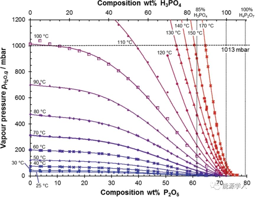 如图6所示,对于固定蒸汽压,磷酸浓度随着温度的升高而增加。因此,在180℃的操作温度下,MEA中的酸浓度低于140℃的操作温度,阳极露点温度为室温。图还显示,对于固定的操作温度,较高的水分压会导致较低的酸浓度。因此,在两种操作温度下,由于阳极露点温度升高而导致的水分压升高会导致酸-水混合物体积的增加。随着本工作中阳极露点温度的升高导致酸中水含量的增加,对质子转移的贡献增加。在这种情况下,质子由水阳离子( H3O+ )形式的水分子携带。因此,从阳极到阴极的水通量增加。这可能导致阳极中的水耗尽和阴极中的水溢出,并因此导致电荷转移电阻的增加。然而,在180℃的较高操作温度下,膜和催化剂层中的酸浓度低于140℃的操作温度。由于焦磷酸( H4P2O7 )的形成,酸浓度甚至可以高于100 %。在这种情况下,由于一些水参与焦磷酸的水合作用,阳极增湿带来的含水量增加不会太大程度上增加质子转移。因此,在180℃的工作温度下,阳极增湿不会显著增加通过膜的水传输。