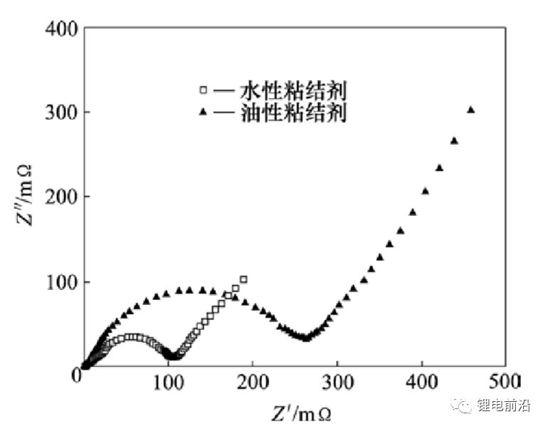 图5所示为不同粘结剂体系的充电态交流阻抗图谱。图中高频区的半圆代表电解液/电极表面钝化膜和双电层中的电荷转移反应,低频区的直线则代表锂离子在固相活性物质中的扩散。从图7可以清晰地看出,油性体系中电解液/电极表面钝化膜和双电层的阻抗要远远大于水性体系的阻抗。由于电极表面阻抗大,在大电流条件下,锂离子在界面的钝化膜和双电层中扩散受到影响,进而影响整个锂离子在电极中的脱/嵌过程,从而影响了电极的倍率性能。