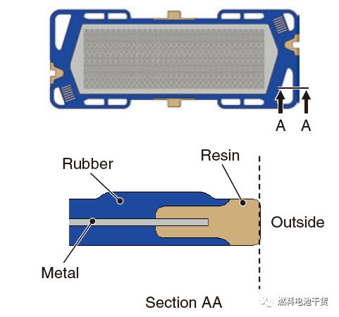燃料电池电堆由数片单电池串联形成。物理学告诉我们,串联电路中电压为积累效应。高压燃料电池电堆的金属双极板必须与外界进行隔离以防触电。通常,双极板被设计放在一个防水和防导电的箱体内,并非采用隔离措施设计单独的双极板。本田在密封圈成型过程将双极板进行导电隔离表面处理,同时在金属双极板外围附上橡胶。下图表示双极板的外围导电隔离结构,树脂包裹金属板,橡胶(即密封圈)覆盖树脂。本田通过上述结构提高导电隔离效果。